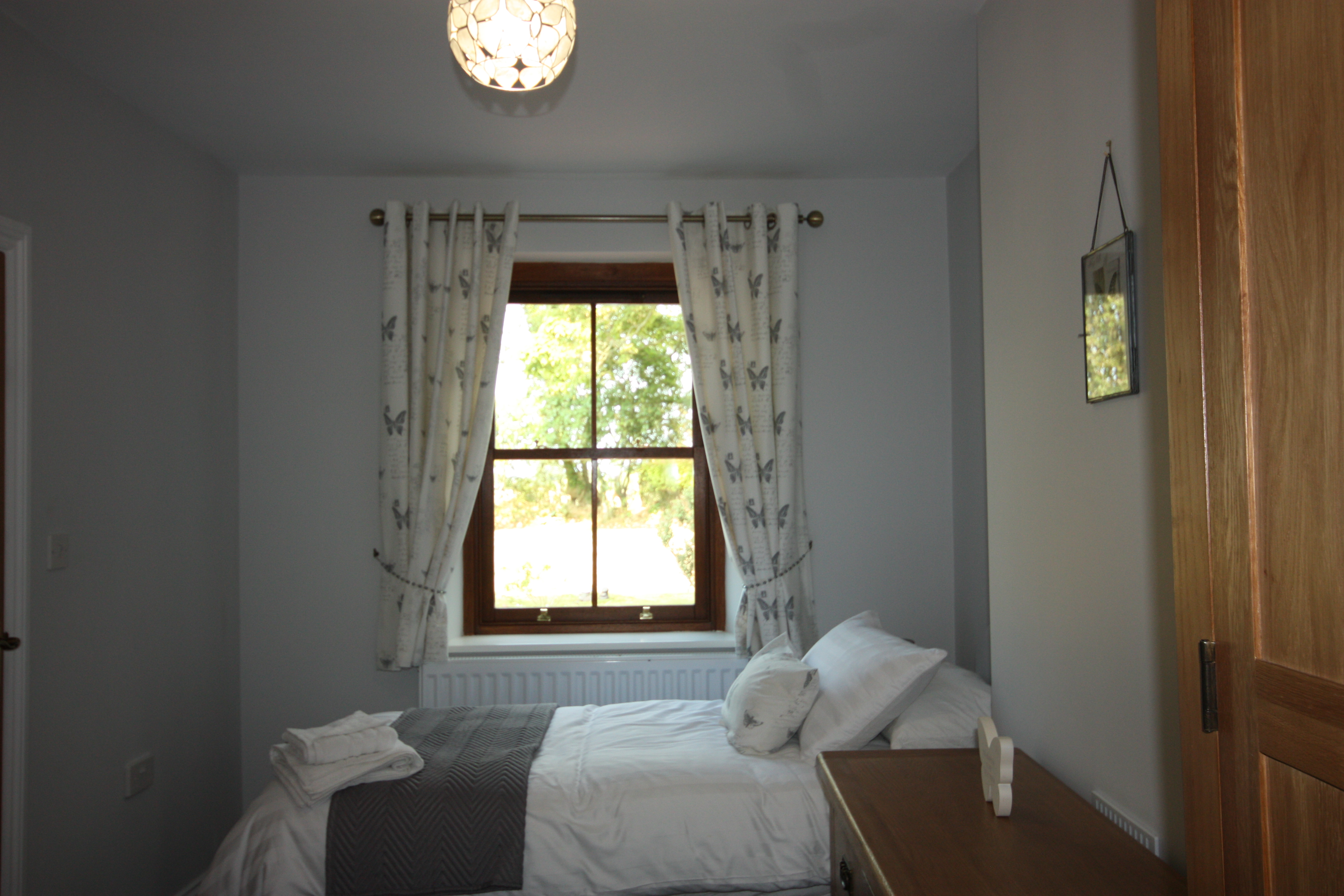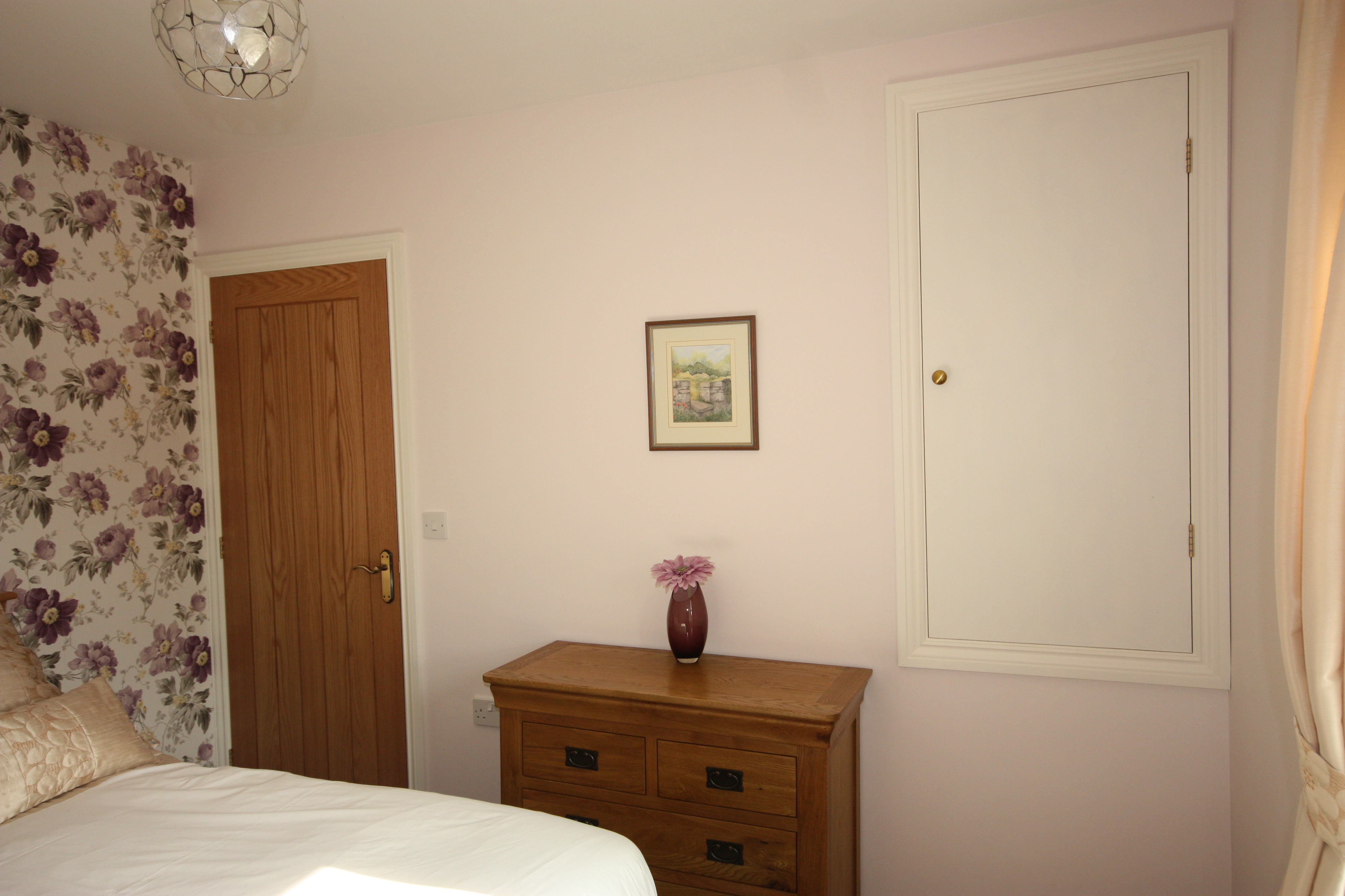 Located on the ground floor, the twin bedroom is accessed by a low doorway from the lounge. Taller guests may have duck to pass through the door which has a headroom of around 6ft 3in (2m). The bedroom features two single beds, oak furniture. Looking out onto the front lawn, the twin bedroom is perfect for catching the sunrise, or watching the red squirrels which frequent the garden!